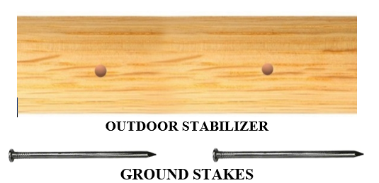 The outdoor “stabilizer” is a wooden footrest with holes for Ground Stakes to secure the footrest to the ground.
